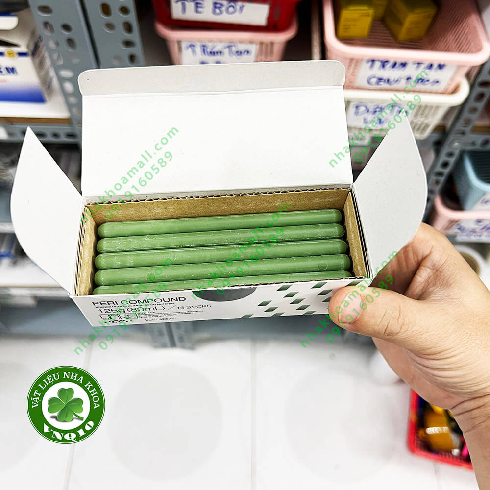 PERI COMPOUND là vật liệu làm vành khít có thể dễ dàng làm mềm (ở nhiệt độ 53 độc C, 125 độ F) và độ dẻo thích hợp để ghi dấu giới hạn khay lấy dấu hàm giả